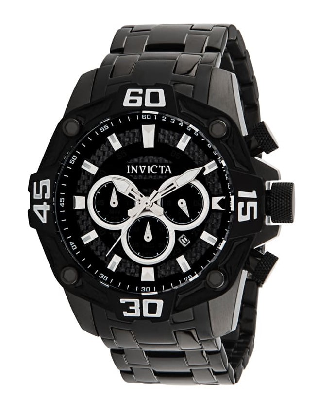 Gunmetal stainless steel case and bracelet. Uni-directional rotating black and white stainless steel and glass fiber bezel. Grey dial with silver-tone hands and index hour markers. Minute markers around the outer rim. Dial Type: Analog. Luminescent hands and markers. Date display between 4 and 5 o'clock position. Chronograph - three sub-dials displaying: 60 second, 60 minute and 24 hour. Hattori Caliber VD53 quartz movement. Scratch resistant Flame Fusion crystal. Pull / push crown. Solid case back. Round case shape, case size: 52 mm. Band width: 26 mm, band length: 7.25 inches. Fold over clasp. Water resistant at 100 meters / 330 feet. Functions: chronograph, date, GMT, second time zone, hour, minute, second. Pro Diver Series. Sport watch style. Watch label: Japan Movt. Invicta Pro Diver Chronograph Quartz Grey Dial Mens Watch 33850.