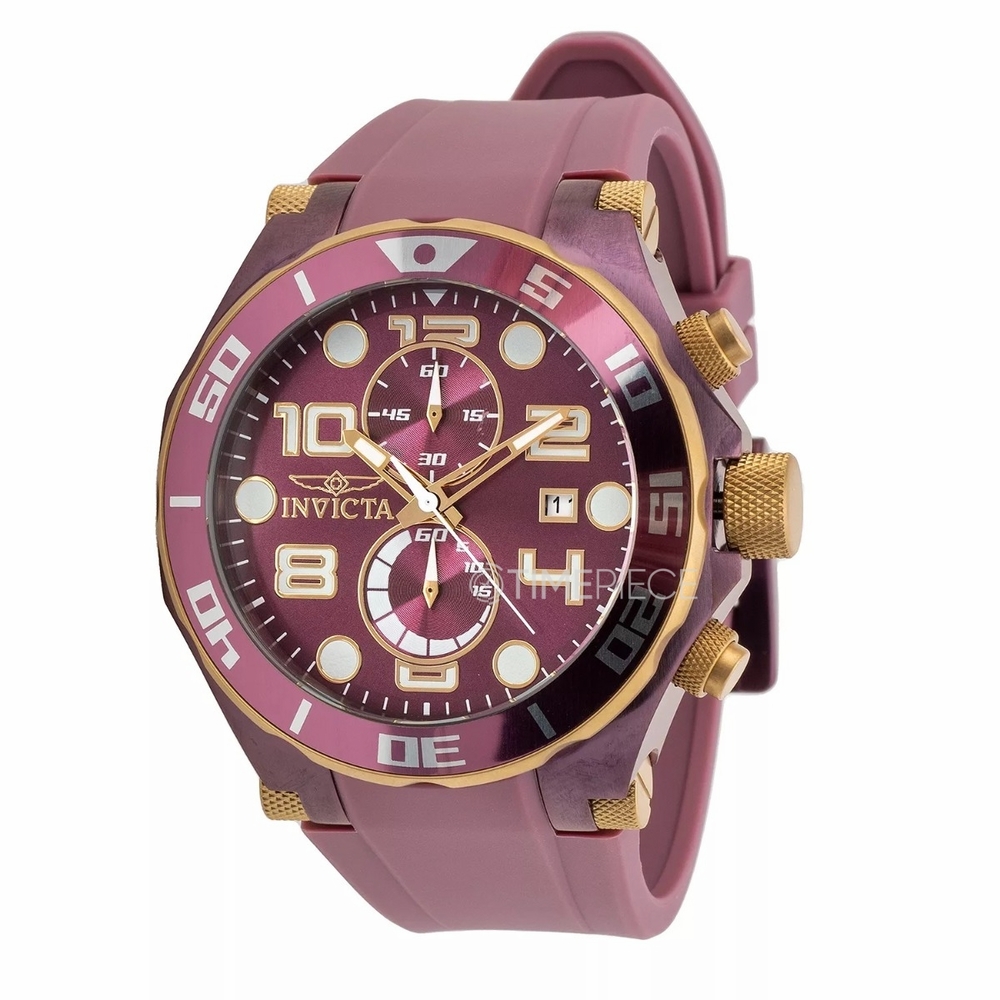 Dark purple stainless steel case with a dark purple silicone strap. Uni-directional rotating dark purple stainless steel bezel. Dark purple dial with gold-tone hands and index-Arabic numeral hour markers. Minute markers around the outer rim. Dial Type: Analog. Luminescent hands and markers. Date display at the 3 o'clock position. Chronograph - two sub-dials displaying: 60 second and 60 minute. Hattori Caliber VD51 quartz movement. Scratch resistant Flame Fusion crystal. Pull / push crown. Solid case back. Round case shape, case size: 50 mm, case thickness: 12.5 mm. Band width: 50 mm, band length: 8.75 inches. Buckle clasp. Water resistant at 100 meters / 330 feet. Functions: chronograph, date, hour, minute, second. Pro Diver Series. Sport watch style. Watch label: Japan Movt. Invicta Pro Diver Chronograph Quartz Mens Watch 40636.