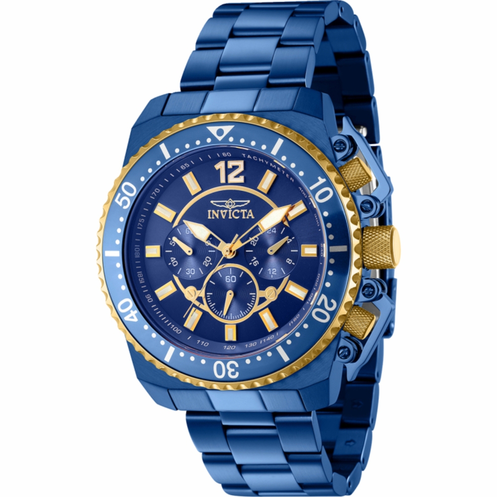 Blue stainless steel case and bracelet. Uni-directional rotating two-tone (gold and blue) stainless steel bezel. Blue dial with gold-tone hands and index-Arabic numeral hour markers. Tachymeter scale around the outer rim. Dial Type: Analog. Luminescent hands and markers. Chronograph - three sub-dials displaying: 60 second, 60 minute and 24 hour. Hattori Caliber VD54 quartz movement. Scratch resistant Flame Fusion crystal. Pull / push crown. Solid case back. Round case shape, case size: 48 mm, case thickness: 12.5 mm. Band width: 24 mm, band length: 7.75 inches. Fold over clasp. Water resistant at 100 meters / 330 feet. Functions: chronograph, GMT, second time zone, hour, minute, second. Pro Diver Series. Casual watch style. Watch label: Japan Movt. Invicta Pro Diver GMT Chronograph Quartz Blue Dial Mens Watch 40900.