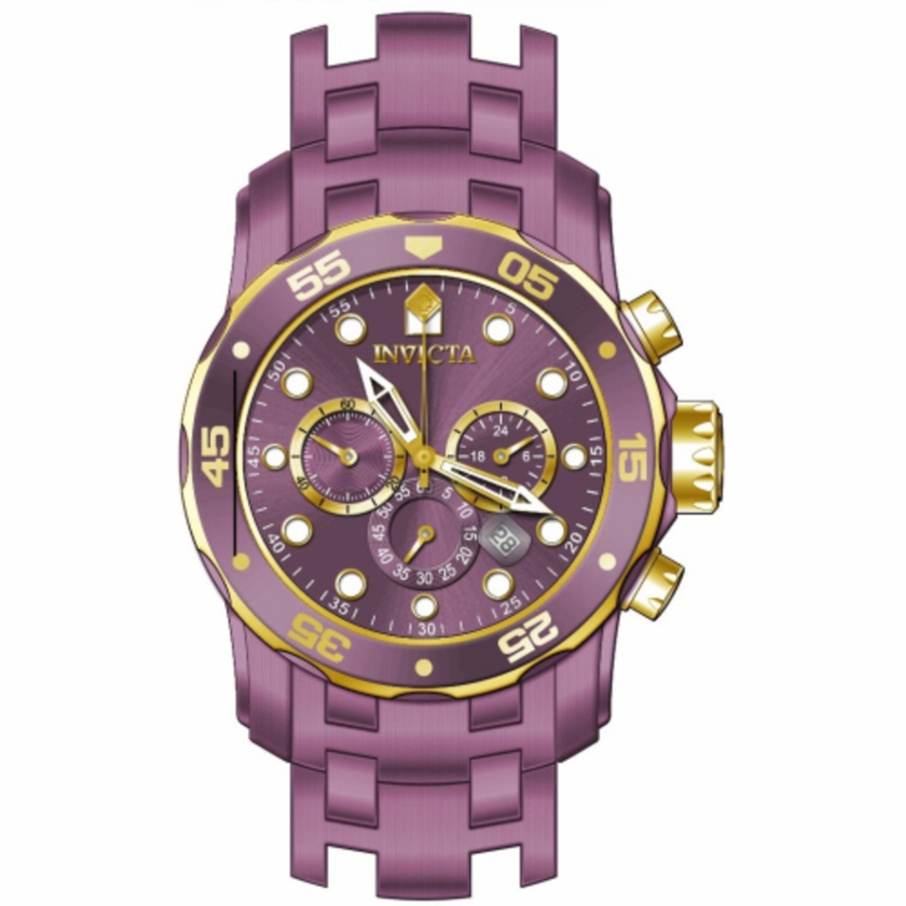 Purple stainless steel case and bracelet. Uni-directional rotating two-tone (light purple and gold) stainless steel bezel. Purple dial with gold-tone hands and index hour markers. Minute markers around the outer rim. Dial Type: Analog. Luminescent hands and markers. Date display between 4 and 5 o'clock position. Chronograph - three sub-dials displaying: 60 second, 60 minute and 24 hour. Hattori Caliber VD53 quartz movement. Scratch resistant Flame Fusion crystal. Pull / push crown. Solid case back. Round case shape, case size: 48 mm, case thickness: 16.7 mm. Band width: 26 mm, band length: 7.25 inches. Fold over clasp. Water resistant at 100 meters / 330 feet. Functions: chronograph, date, GMT, second time zone, hour, minute, second. Pro Diver Series. Casual watch style. Watch label: Japan Movt. Invicta Pro Diver GMT Chronograph Quartz Purple Dial Mens Watch 40244.