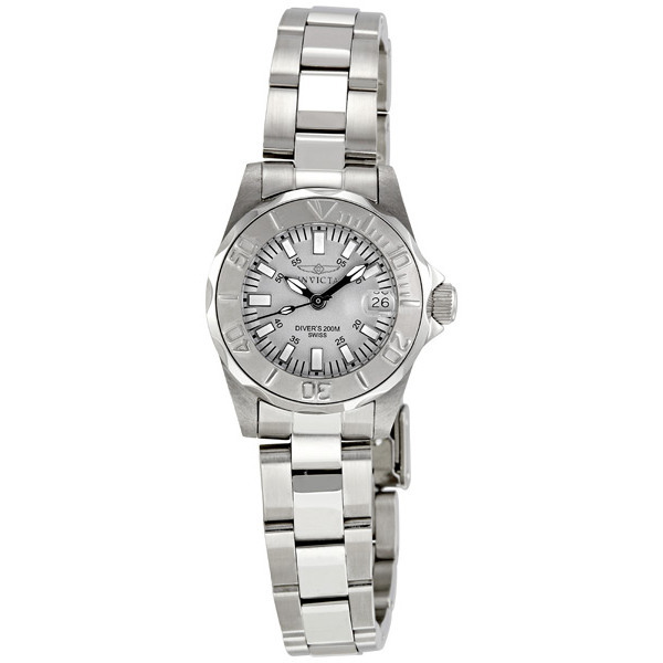 Stainless steel case with a stainless steel bracelet. Unidirectional rotating stainless steel bezel. Grey dial with luminous hands and index hour markers. Minute markers around the outer rim. Dial Type: Analog. Luminescent hands and hour markers. Date displays at the 3 o'clock position. Quartz movement. Scratch resistant sapphire crystal. Pull / push crown. Screw down solid case back. Case size: 27 mm. Case thickness: 11 mm. Round case shape. Band width: 13 mm. Diver clasp with a safety release. Water resistant at 200 meters / 660 feet. Functions: hour, minute, second, date. Additional Info: auto date w/magnifier. Fashion watch style. Watch label: Swiss. Invicta Pro Diver Light Gray Dial Stainless Steel Ladies Watch 7066.