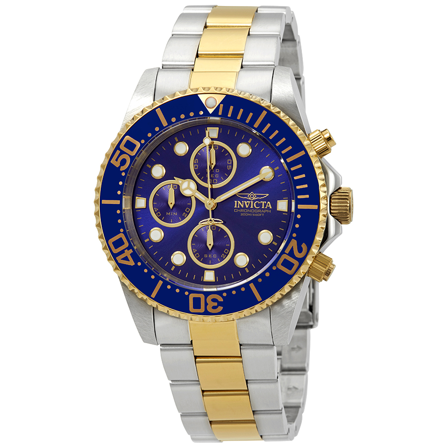 Stainless steel case with a two-tone (silver-tone and 18kt gold-plated) stainless steel bracelet. Uni-directional rotating 18kt gold-plated bezel with a blue ion-plated ring. Blue dial with luminous gold-tone hands and dot hour markers. Minute markers around the outer rim. Dial Type: Analog. Luminescent hands and markers. Chronograph - three sub-dials displaying: 60 second, 60 minute and 1/10 of a second. SII caliber VD55B quartz movement. Scratch resistant Flame Fusion crystal. 18kt gold-plated push / pull crown. Solid case back. Round case shape. Case size: 44 mm. Case thickness: 12 mm. Band width: 22 mm. Band length: 9 inches. Fold over clasp with a safety release. Water resistant at 200 meters / 660 feet. Functions: hours, minutes, seconds, chronograph. Pro Diver Series. Casual watch style. Invicta Pro Diver Chronograph Blue Dial Mens Watch 1773.