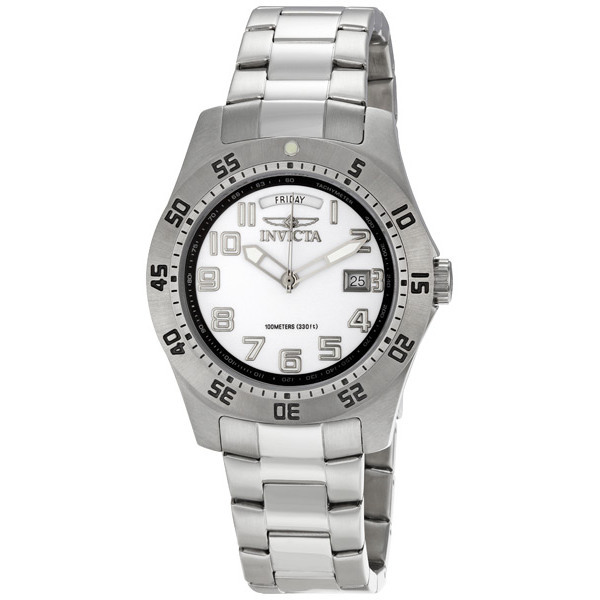 Stainless steel case with a stainless steel bracelet. Uni-directional rotating stainless steel bezel. White dial with luminous skeleton hands and Arabic numeral hour markers. Tachymeter markers around the outer rim. Minute markers around the inner bezel. Dial Type: Analog. Luminescent hands. Date display at the 3 o'clock position. Day of the week display centered on the 12 o'clock position. Caliber VJ55(3W) quartz movement. Scratch resistant Flame Fusion crystal. Textured steel crown. Solid case back. Round case shape. Case size: 44.5 mm. Case thickness: 12.5 mm. Band width: 20 mm. Band length: 9.5 inches. Fold over clasp with a push button release. Water resistant at 100 meters / 330 feet. Functions: date, hour, minut, second. Pro Diver Series. Sport watch style. Item Variations: day-and-date. Invicta Pro Diver White Dial Stainless Steel Mens Watch 5249.