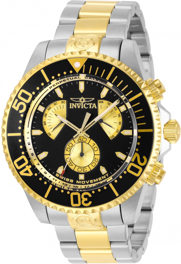 Stainless steel case with a two-tone (silver-tone and yellow gold-tone) stainless steel bracelet. Uni-directional rotating yellow gold-tone bezel with a black ring bezel. Black dial with luminous yellow gold-tone hands and index hour markers. Date scale. Minute markers around the outer rim. Dial Type: Analog. Luminescent hands and markers. Perpetual calendar. Three gold multi-function sub-dials displaying: month, day of the week and small second. ETA caliber G15.562 quartz movement. Scratch resistant mineral crystal. Screw down crown. Solid case back. Round case shape. Case size: 47 mm. Case thickness: 16 mm. Band width: 22 mm. Band length: 8.25 inches. Fold over clasp. Water resistant at 300 meters / 1000 feet. Functions: perpetual calendar, chronograph, retrograde, month, date, day, hour, minute, small second. Pro Diver Series. Dive watch style. Watch label: Swiss Movt. Invicta Pro Diver Perpetual Chronograph Quartz Mens Watch 29972.
