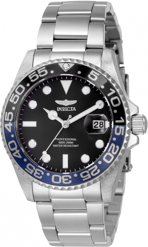 Stainless steel case with a stainless steel bracelet. Uni-directional rotating stainless steel bezel with an inlaid black and blue (Batman) ring. Black dial with luminous silver-tone hands and dot hour markers. Minute markers around the outer rim. Dial Type: Analog. Luminescent hands and markers. Date display at the 3 o'clock position. Hattori caliber PC32 quartz movement. Scratch resistant Flame Fusion crystal. Pull / push crown. Solid case back. Round case shape. Case size: 38 mm. Case thickness: 11 mm. Band width: 20 mm. Band length: 7 inches. Fold over clasp. Water resistant at 200 meters / 660 feet. Functions: date, hour, minute, second. Pro Diver Series. Casual watch style. Watch label: Japan Movt. Invicta Pro Diver Quartz Black Dial Batman Bezel Ladies Watch 33258.