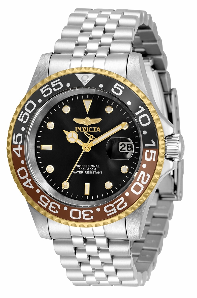 Silver-tone stainless steel case and bracelet. Uni-directional rotating black and red (coke) stainless steel bezel. Black dial with gold-tone Mercedes-logo and Breguet-style shape hands and index hour markers. Minute markers around the outer rim. Dial Type: Analog. Luminescent hands and markers. Date display at the 3 o'clock position. Hattori Caliber PC32 quartz movement. Scratch resistant Flame Fusion crystal. Pull / push crown. Solid case back. Round case shape, case size: 40 mm. Band width: 20 mm, band length: 7.25 inches. Fold over clasp. Water resistant at 100 meters / 330 feet. Functions: date, hour, minute, second. Pro Diver Series. Casual watch style. Watch label: Japan Movt. Invicta Pro Diver Quartz Black Dial Coke Bezel Mens Watch 34103.