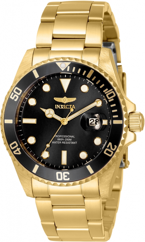 Gold-tone stainless steel case and bracelet. Uni-directional rotating two-tone (black and gold-tone) stainless steel bezel. Black dial with gold-tone Mercedes-logo and Breguet-style shape hands and index hour markers. Minute markers around the outer rim. Dial Type: Analog. Luminescent hands and markers. Date display at the 3 o'clock position. Hattori Caliber PC32 quartz movement. Scratch resistant Flame Fusion crystal. Pull / push crown. Solid case back. Round case shape, case size: 38 mm, case thickness: 11 mm. Band width: 20 mm, band length: 7 inches. Fold over clasp. Water resistant at 200 meters / 660 feet. Functions: date, hour, minute, second. Pro Diver Series. Sport watch style. Watch label: Japan Movt. Invicta Pro Diver Quartz Black Dial Ladies Watch 33277.