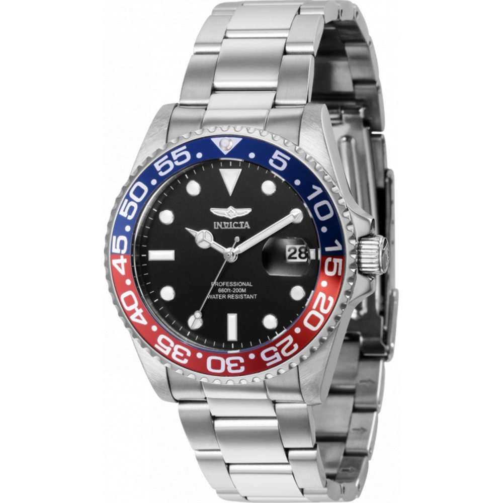 Silver-tone stainless steel case and bracelet. Uni-directional rotating silver-tone stainless steel bezel with a blue and red ring. Black dial with silver-tone hands and index hour markers. Minute markers around the outer rim. Dial Type: Analog. Luminescent hands and markers. Date display at the 3 o'clock position. Hattori Caliber PC32 quartz movement. Scratch resistant Flame Fusion crystal. Pull / push crown. Solid case back. Round case shape, case size: 38 mm, case thickness: 11 mm. Band width: 20 mm, band length: 7 inches. Fold over safety clasp. Water resistant at 200 meters / 660 feet. Functions: date, hour, minute, second. Pro Diver Series. Casual watch style. Watch label: Japan Movt. Invicta Pro Diver Quartz Black Dial Ladies Watch 36528.