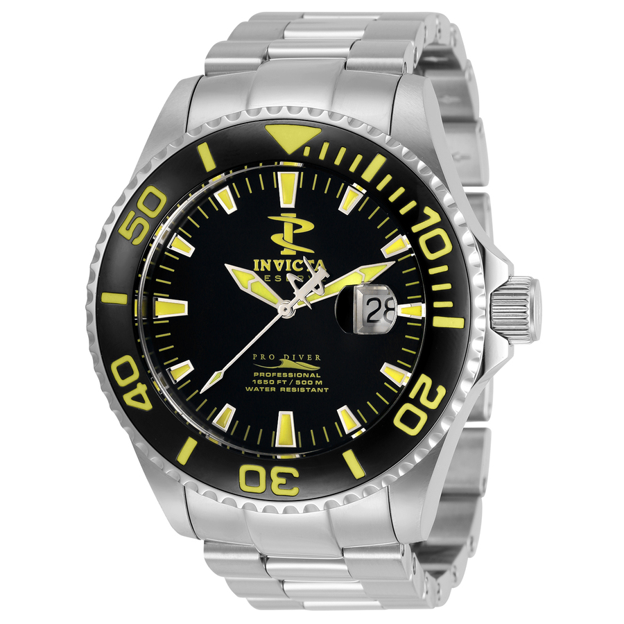 Stainless steel case with a stainless steel bracelet. Uni-directional rotating stainless steel bezel with an inlaid black ring. Black dial with luminous silver-tone hands and index hour markers. Minute markers around the outer rim. Dial Type: Analog. Luminescent hands and markers. Date display at the 3 o'clock position. Ronda caliber 715 quartz movement. Scratch resistant Flame Fusion crystal. Screw down crown. Solid case back. Round case shape. Case size: 47 mm. Case thickness: 15 mm. Band width: 24 mm. Band length: 8 inches. Hidden fold over clasp. Water resistant at 500 meters / 1650 feet. Functions: date, hour, minute, second, battery eol indicator. Pro Diver Series. Dive watch style. Watch label: Swiss Movt. Invicta Pro Diver Quartz Black Dial Mens Watch 34784.