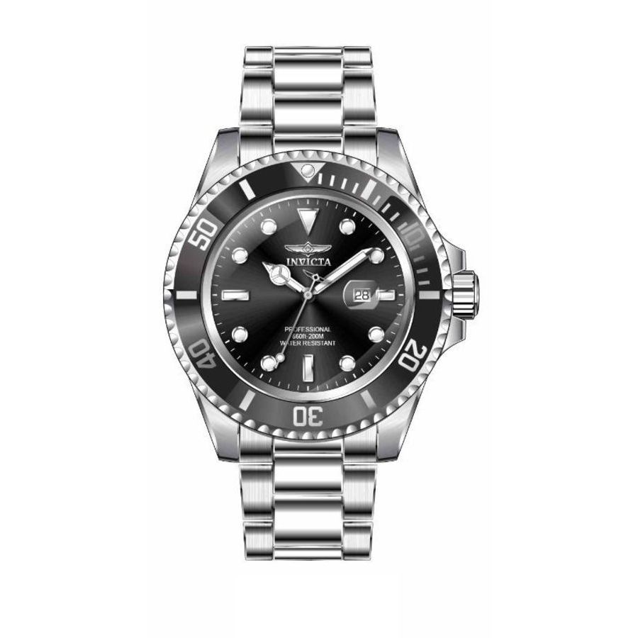 Silver-tone stainless steel case and bracelet. Uni-directional rotating two-tone (silver-tone and black) stainless steel bezel. Black dial with silver-tone Mercedes-logo and Breguet-style shape hands and index hour markers. Minute markers around the outer rim. Dial Type: Analog. Luminescent hands and markers. Date display at the 3 o'clock position. Hattori Calibre VJ42 quartz movement. Scratch resistant Flame Fusion crystal. Pull / push crown. Solid case back. Round case shape, case size: 54 mm. Band width: 26 mm, band length: 8.25 inches. Fold over clasp. Water resistant at 100 meters / 330 feet. Functions: date, hour, minute, second. Pro Diver Series. Casual watch style. Watch label: Japan Movt. Invicta Pro Diver Quartz Black Dial Mens Watch 36051.
