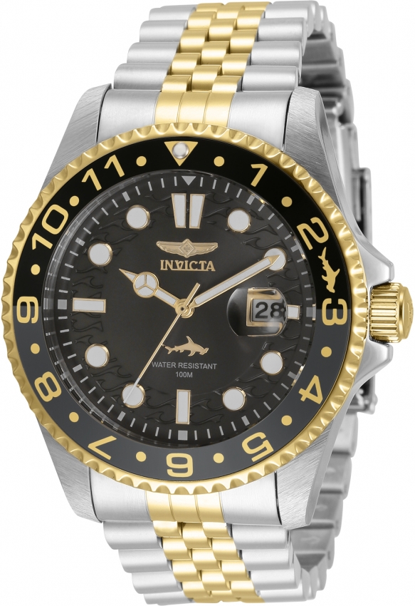 Stainless steel case with a two-tone (silver-tone and gold-tone) stainless steel bracelet. Uni-directional rotating gold-tone bezel with a black aluminum ring. Black dial with luminous gold-tone hands and dot hour markers. Minute markers around the outer rim. Dial Type: Analog. Luminescent hands and markers. Date display at the 3 o'clock position. Hattori caliber PC32 quartz movement. Scratch resistant Flame Fusion crystal. Pull / push crown. Solid case back. Round case shape. Case size: 43 mm. Case thickness: 11.5 mm. Band width: 22 mm. Band length: 7 inches. Deployment clasp with a push button release. Water resistant at 100 meters / 330 feet. Functions: date, hour, minute, second. Pro Diver Series. Casual watch style. Watch label: Japan Movt. Invicta Pro Diver Quartz Black Dial Two-tone Mens Watch 35131.
