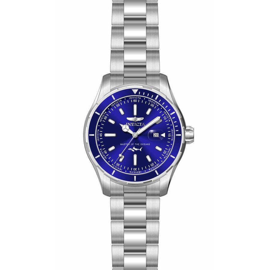 Silver-tone stainless steel case and bracelet. Uni-directional rotating stainless steel bezel with an inalid blue ring. Blue dial with luminous silver-tone hands and index hour markers. Arabic numeral minute markers (at 5 minute intervals). Minute markers around the outer rim. Dial Type: Analog. Luminescent hands and markers. Date display at the 3 o'clock position. Hattori caliber PC32 quartz movement. Scratch resistant Flame Fusion crystal. Pull / push crown. Solid case back. Round case shape. Case size: 46 mm. Case thickness: 11.5 mm. Band width: 22 mm, band length: 8.50 inches. Fold over clasp. Water resistant at 100 meters / 330 feet. Functions: date, hour, minute, second. Pro Diver Series. Casual watch style. Watch label: Japan Movt. Invicta Pro Diver Quartz Blue Dial Mens Watch 35591.