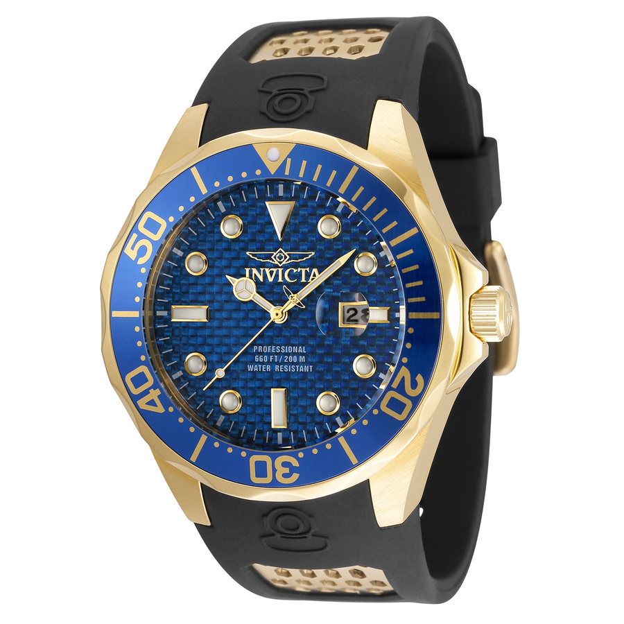 Gold-tone stainless steel case with a black polyurethane strap. Uni-directional rotating blue stainless steel bezel. Blue dial with gold-tone Mercedes-logo and Breguet-style shape hands and index hour markers. Minute markers around the outer rim. Dial Type: Analog. Luminescent hands and markers. Date display at the 3 o'clock position. Hattori Caliber PC32 quartz movement. Scratch resistant mineral crystal. Pull / push crown. Solid case back. Round case shape, case size: 47 mm, case thickness: 14 mm. Band width: 22 mm, band length: 8.50 inches. Buckle clasp. Water resistant at 200 meters / 660 feet. Functions: date, hour, minute, second. Pro Diver Series. Casual watch style. Watch label: Japan Movt. Invicta Pro Diver Quartz Blue Dial Mens Watch 36554.