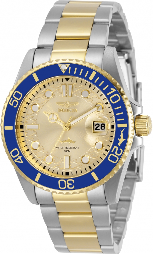 Stainless steel case with a two-tone (silver-tone and yellow gold-tone) stainless steel bracelet. Uni-directional rotating coin edge yellow gold-tone bezel with a blue aluminum (count-up elapsed time) ring. Gold dial with luminous yellow gold-tone hands and dot hour markers. Minute markers around the outer rim. Dial Type: Analog. Luminescent hands and markers. Date display at the 3 o'clock position. Hattori caliber PC32 quartz movement. Scratch resistant Flame Fusion crystal. Pull / push crown. Solid case back. Round case shape. Case size: 38 mm. Case thickness: 11 mm. Band width: 20 mm. Band length: 7 inches. Fold over clasp. Water resistant at 100 meters / 330 feet. Functions: date, hour, minute, second. Pro Diver Series. Casual watch style. Watch label: Japan Movt. Invicta Pro Diver Quartz Gold Dial Ladies Watch 30482.