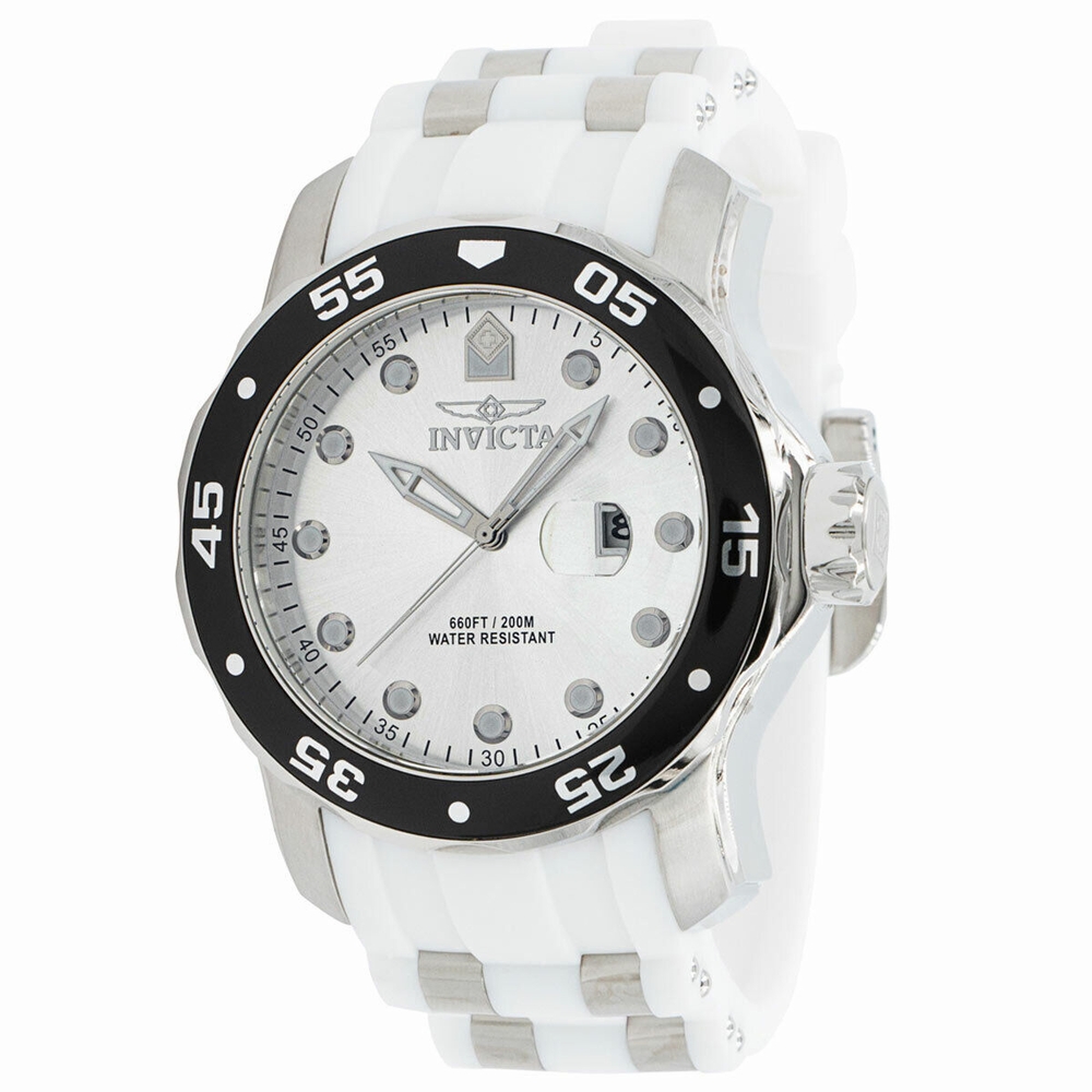 Stainless steel case with a white silicone strap with stainless steel inserts. Uni-directional rotating stainless steel bezel with an inlaid black ring. Silver dial with luminous silver-tone hands and dot hour markers. Minute markers around the outer rim. Dial Type: Analog. Luminescent hands and markers. Date display at the 3 o'clock position. Hattori caliber PC32 quartz movement. Scratch resistant Flame Fusion crystal. Pull / push crown. Solid case back. Round case shape. Case size: 48 mm. Case thickness: 16.7 mm. Band width: 26 mm. Band length: 8.25 inches. Tang clasp. Water resistant at 100 meters / 330 feet. Functions: date, hour, minute, second. Pro Diver Series. Casual watch style. Watch label: Japan Movt. Invicta Pro Diver Quartz Silver Dial Mens Watch 39411.