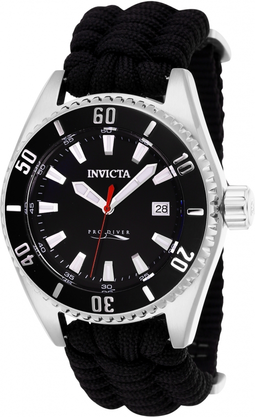 Silver-tone stainless steel case with a black nylon strap. Uni-directional rotating silver-tone stainless steel with a black ring bezel. Black dial with luminous silver-tone sword-shaped hands and index hour markers. Minute markers around the outer rim. Dial Type: Analog. Luminescent hands and markers. Date display at the 3 o'clock position. SII Caliber NH35A automatic movement with a 41-hour power reserve. Scratch resistant mineral crystal. Pull / push crown. Transparent case back. Round case shape, case size: 46 mm, case thickness: 15 mm. Band width: 22 mm, band length: 8.5 inches. Tang clasp. Water resistant at 100 meters / 330 feet. Functions: date, hour, minute, second. Casual watch style. Watch label: Japan Movt. Invicta Pro Diver Automatic Black Dial Mens Watch 26024.
