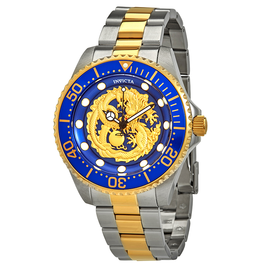 Silver-tone stainless steel case with a two-tone (silver-tone and yellow gold-tone) stainless steel bracelet. Uni-directional rotating yellow gold-tone stainless steel with a blue ring bezel. Blue (gold dragon) dial with Mercedes-logo, sword, and Breguet-style shape hands and dot hour markers. Dial Type: Analog. Luminescent hands and markers. SII Caliber NH35A Automatic movement, containing 24 Jewels, bitting at 21600 vph, and has a power reserve of approximately 41 hours. Scratch resistant mineral crystal. Pull / push crown. Transparent case back. Round case shape, case size: 47 mm, case thickness: 15 mm. Band width: 22 mm, band length: 8.75 inches. Fold over clasp. Water resistant at 100 meters / 330 feet. Functions: hour, minute, second. Pro Diver Dragon Series. Casual watch style. Watch label: Japan Movt. Invicta Pro Diver Dragon Automatic Blue Dial Two-tone Mens Watch 26491.