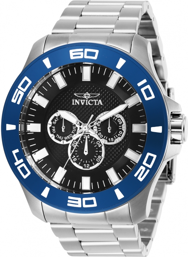 Silver-tone stainless steel case with a silver-tone stainless steel bracelet. Fixed blue and silver-tone stainless steel and aluminum bezel. Black dial with silver-tone hands and index hour markers. Minute markers around the outer rim. Dial Type: Analog. Luminescent hands and markers. Date display at the 3 o'clock position. Three - 24 hour, date and day of the week subdials. TMI Caliber VH63 quartz movement. Scratch resistant flame fusion crystal. Pull / push crown. Solid case back. Round case shape, case size: 50 mm, case thickness: 14 mm. Band width: 26 mm, band length: 7.25 inches. Fold over clasp. Water resistant at 100 meters / 330 feet. Functions: date, day, GMT, second time zone, hour, minute, second. Casual watch style. Watch label: Japan Movt. Invicta Pro Diver Quartz Black Dial Mens Watch 28224.
