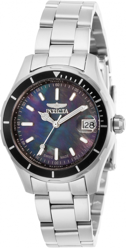 Silver-tone stainless steel case with a silver-tone stainless steel bracelet. Uni-directional rotating black stainless steel bezel. Black dial with silver-tone Mercedes-logo, sword, and Breguet-style shape hands and index hour markers. Minute markers around the outer rim. Dial Type: Analog. Luminescent hands and markers. Date display at the 3 o'clock position. Ronda Caliber 505 quartz movement. Scratch resistant flame fusion crystal. Pull / push crown. Solid case back. Round case shape, case size: 34 mm, case thickness: 11.1 mm. Band width: 16 mm, band length: 7.75 inches. Fold over clasp. Water resistant at 100 meters / 330 feet. Functions: date, hour, minute, second. Casual watch style. Watch label: Swiss Made. Invicta Pro Diver Quartz Black Dial Ladies Watch 28643.