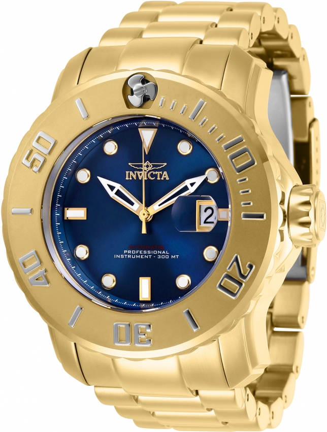 Gold, stainless steel stainless steel case with a gold-tone stainless steel bracelet. Uni-directional rotating gold and steel stainless steel bezel. Blue dial with gold-tone hands and index hour markers. Minute markers around the outer rim. Dial Type: Analog. Luminescent hands and markers. Date display at the 3 o'clock position. SII Caliber NH35A automatic movement with a 41-hour power reserve. Scratch resistant mineral crystal. Screw down crown. Transparent case back. Round case shape, case size: 50 mm, case thickness: 19.4 mm. Band width: 26 mm, band length: 8.25 inches. Fold over clasp. Water resistant at 300 meters / 1000 feet. Functions: date, hour, minute, second. Dive watch style. Watch label: Japan Movt. Invicta Pro Diver Automatic Blue Dial Mens Watch 29353.