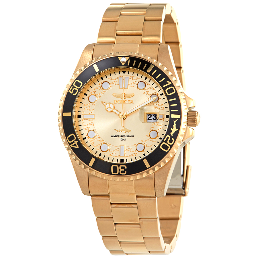 Yellow gold-tone stainless steel case with a yellow gold-tone stainless steel bracelet. Uni-directional rotating black top ring stainless steel bezel. Champagne dial with luminous yellow gold-tone Mercedes-logo, sword, and Breguet-style shape hands and dot hour markers. Minute markers around the outer rim. Dial Type: Analog. Luminescent hands and markers. Date display at the 3 o'clock position. Hattori Caliber PC32 quartz movement. Scratch resistant flame fusion crystal. Pull / push crown. Solid case back. Round case shape, case size: 43 mm, case thickness: 12 mm. Band width: 22 mm, band length: 7.25 inches. Fold over with safety release clasp. Water resistant at 100 meters / 330 feet. Functions: date, hour, minute, second. Casual watch style. Watch label: Japan Movt. Invicta Pro Diver Champagne Dial Yellow Gold-tone Mens Watch 30025.