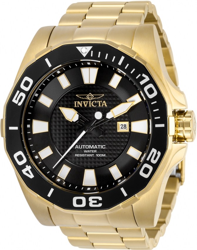 Gold-tone stainless steel case with a gold-tone stainless steel bracelet. Uni-directional rotating two-tone (black and gold-tone) stainless steel and aluminum bezel. Black dial with gold-tone hands and index hour markers. Minute markers around the outer rim. Dial Type: Analog. Luminescent hands and markers. Date display at the 3 o'clock position. Miyota Caliber 821A-21D(3W) Automatic movement, containing 21 Jewels, bitting at 21600 vph, and has a power reserve of approximately 42 hours. Scratch resistant flame fusion crystal. Pull / push crown. Transparent case back. Dodecagon case shape, case size: 53 mm, case thickness: 16 mm. Band width: 26 mm, band length: 7.75 inches. Fold over clasp. Water resistant at 100 meters / 330 feet. Functions: hour, minute, second. Pro Diver Series. Casual watch style. Watch label: Japan Movt. Invicta Pro Diver Automatic Black Dial Mens Watch 30515.