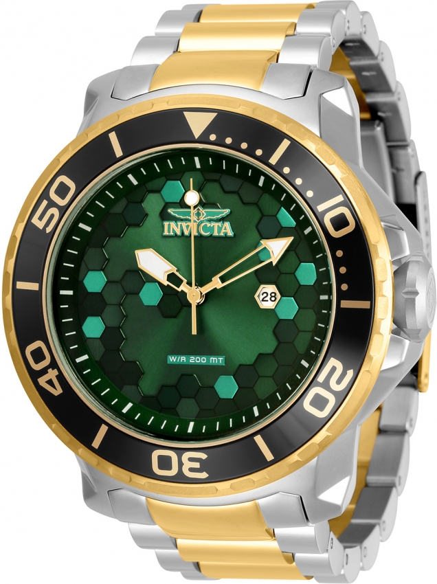 Stainless steel case with a two-tone (silver-tone and yellow gold-tone) stainless steel bracelet. Fixed yellow gold-tone bezel with a black aluminum bezel. Green dial with luminous yellow gold-tone hands and index hour markers. Minute markers around the outer rim. Dial Type: Analog. Luminescent hands. Date display at the 3 o'clock position. Hattori caliber PC32A quartz movement. Scratch resistant mineral crystal. Screw down crown. Solid case back. Round case shape. Case size: 52 mm. Case thickness: 15.4 mm. Band width: 26 mm. Band length: 8.25 inches. Fold over clasp. Water resistant at 200 meters / 660 feet. Functions: date, hour, minute, second. Pro Diver Series. Casual watch style. Watch label: Japan Movt. Invicta Pro Diver Quartz Green Dial Two-tone Mens Watch 30565.