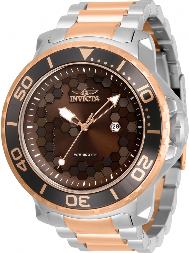 Rose gold and black and silver-tone stainless steel and aluminum case with a silver-tone and rose gold stainless steel bracelet. Uni-directional rotating black and rose gold stainless steel and aluminum bezel. Brown dial with rose gold-tone hands and index hour markers. Minute markers around the outer rim. Dial Type: Analog. Luminescent hands. Date display at the 3 o'clock position. Hattori Caliber PC32A quartz movement. Scratch resistant mineral crystal. Screw down crown. Solid case back. Round case shape, case size: 52 mm, case thickness: 15.4 mm. Band width: 26 mm, band length: 8.25 inches. Fold over clasp. Water resistant at 200 meters / 660 feet. Functions: date, hour, minute, second. Casual watch style. Watch label: Japan Movt. Invicta Pro Diver Quartz Brown Dial Mens Watch 30566.