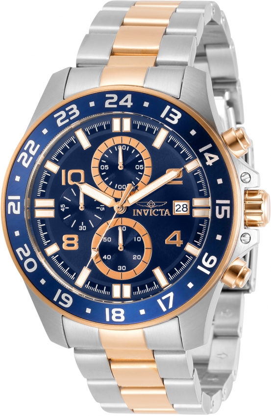 Silver-tone stainless steel case with a silver-tone and rose gold stainless steel bracelet. Blue and silver and rose gold stainless steel bezel. Blue dial with gold-tone hands and Arabic numeral and index hour markers. Minute markers around the outer rim. Dial Type: Analog. Luminescent hands and markers. Date display at the 3 o'clock position. Chronograph - sub-dials displaying: three - 60 second, 60 minute and 1/10th of a second. Hattori Caliber VD57 quartz movement. Scratch resistant flame fusion crystal. Pull / push crown. Solid case back. Round case shape, case size: 45 mm, case thickness: 13 mm. Band width: 22 mm, band length: 7.25 inches. Fold over clasp. Water resistant at 100 meters / 330 feet. Functions: chronograph, date, hour, minute, second. Sport watch style. Watch label: Japan Movt. Invicta Pro Diver Chronograph Quartz Blue Dial Mens Watch 30711.