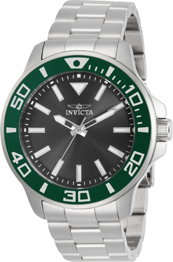 Silver-tone stainless steel case with a silver-tone stainless steel bracelet. Green stainless steel bezel. Charcoal dial with silver-tone hands and index hour markers. Minute markers around the outer rim. Dial Type: Analog. Luminescent hands and markers. TMI Caliber PC21J quartz movement. Scratch resistant flame fusion crystal. Pull / push crown. Solid case back. Round case shape, case size: 46 mm, case thickness: 12 mm. Band width: 22 mm, band length: 7.25 inches. Fold over clasp. Water resistant at 100 meters / 330 feet. Functions: hour, minute, second. Casual watch style. Watch label: Japan Movt. Invicta Pro Diver Quartz Charcoal Dial Mens Watch 30746.