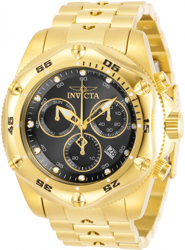 Yellow gold-tone stainless steel case and bracelet. Uni-directional rotating yellow gold-tone bezel. Black dial with luminous yellow gold-tone hands and dot hour markers. Minute markers around the outer rim. Dial Type: Analog. Luminescent hands and markers. Date display between the 4 and 5 o'clock positions. Chronograph - two sub-dials displaying: 60 second and 30 minute. Day of the week sub-dial. Ronda caliber Z60 FE quartz movement. Scratch resistant mineral crystal. Screw down crown. Solid case back. Round case shape. Case size: 51 mm. Case thickness: 20 mm. Band width: 26 mm. Band length: 8.25 inches. Fold over clasp. Water resistant at 100 meters / 330 feet. Functions: chronograph, date, day, hour, minute, second. Pro Diver Series. Sport watch style. Watch label: Swiss Movt. Invicta Pro Diver Chronograph Quartz Black Dial Mens Watch 31609.