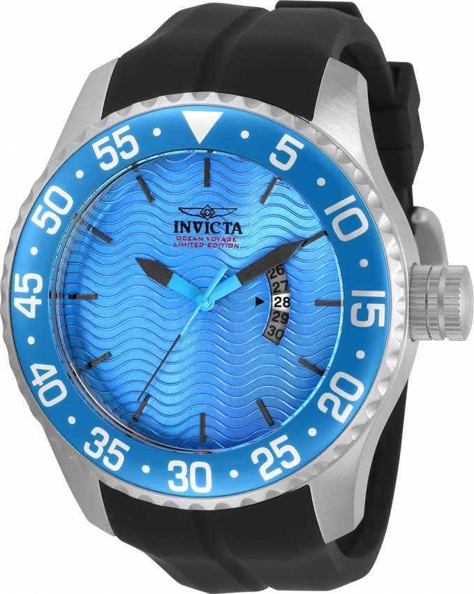 Stainless steel case with a black silicone strap. Uni-directional rotating stainless steel bezel with a blue ring. Blue dial with black and blue sword-shaped hands and index hour markers. Dial Type: Analog. Date display at the 3 o'clock position. Hattori caliber PC32 quartz movement. Scratch resistant Flame Fusion crystal. Pull / push crown. Solid case back. Round case shape. Case size: 50 mm. Band width: 26 mm. Band length: 8.75 inches. Tang clasp. Water resistant at 100 meters / 330 feet. Functions: date, hour, minute, second. Pro Diver Series. Casual watch style. Watch label: Japan Movt. Invicta Pro Diver Quartz Blue Dial Mens Watch 32657.