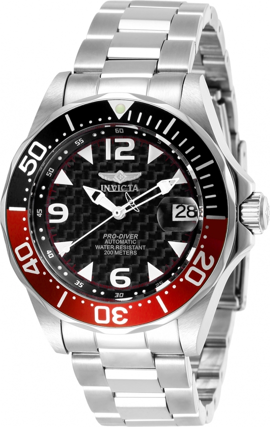 Silver-tone stainless steel case with a silver-tone stainless steel bracelet. Uni-directional rotating black and red (coke) stainless steel bezel. Black dial with silver-tone hands and Arabic numeral and index hour markers. Minute markers around the outer rim. Dial Type: Analog. Luminescent hands and markers. Date display at the 3 o'clock position. SII Caliber NH35A automatic movement with a 41-hour power reserve. Scratch resistant mineral crystal. Screw down crown. Transparent case back. Round case shape. Case size: 40 mm. Band width: 20 mm, band length: 8 inches. Fold over clasp. Water resistant at 200 meters / 660 feet. Functions: date, hour, minute, second. Casual watch style. Watch label: Japan Movt. Invicta Pro Diver Automatic Black Dial Coke Bezel Mens Watch 3478.