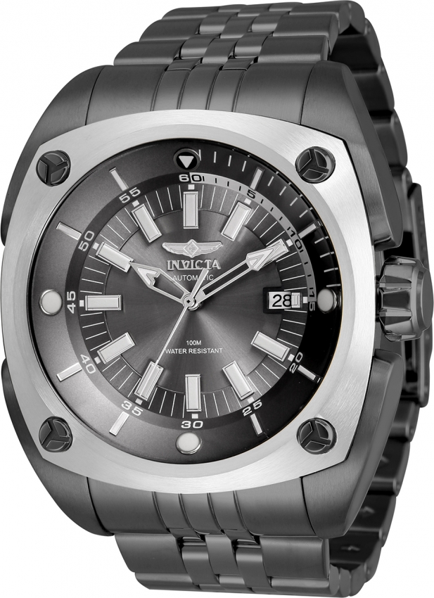 Gunmetal stainless steel case and bracelet. Fixed gunmetal stainless steel bezel. Charcoal dial with silver-tone hands and index hour markers. Minute markers around the outer rim. Dial Type: Analog. Luminescent hands and markers. Date display at the 3 o'clock position. TMI Caliber NH35 Automatic movement, containing 24 Jewels, bitting at 21600 vph, and has a power reserve of approximately 41 hours. Scratch resistant Flame Fusion crystal. Pull / push crown. Transparent see through case back. Cushion case shape, case size: 48 mm, case thickness: 11 mm. Band width: 28 mm, band length: 7.25 inches. Fold over clasp. Water resistant at 100 meters / 330 feet. Functions: date, hour, minute, second. Reserve Series. Casual watch style. Watch label: Japan Movt. Invicta Reserve Automatic Charcoal Dial Mens Watch 32067.