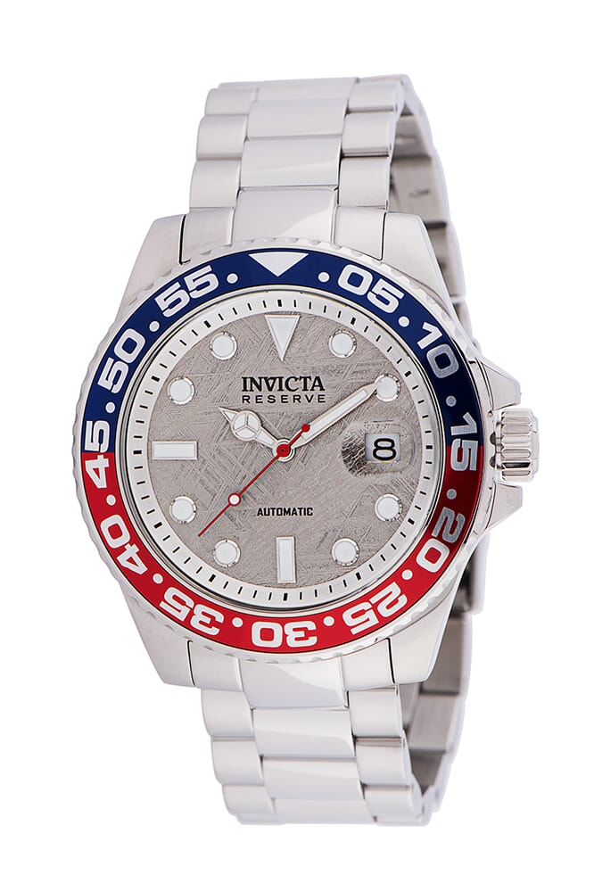 Silver-tone and blue and red stainless steel and aluminum case with a silver-tone stainless steel bracelet. Uni-directional rotating blue and red (pepsi) stainless steel and aluminum bezel. Silver-tone dial with silver-tone Mercedes-logo and Breguet-style shape hands and index hour markers. Minute markers around the outer rim. Dial Type: Analog. Luminescent hands and markers. Date display at the 3 o'clock position. SII Caliber NH35A Automatic movement, containing 24 Jewels, bitting at 21600 vph, and has a power reserve of approximately 41 hours. Scratch resistant mineral crystal. Screw down crown. Transparent see through case back. Round case shape, case size: 46 mm, case thickness: 15.25 mm. Band width: 22 mm, band length: 8.25 inches. Buckle clasp. Water resistant at 100 meters / 330 feet. Functions: date, hour, minute, second. Reserve Series. Casual watch style. Watch label: Japan Movt. Invicta Reserve Automatic Silver Dial Pepsi Bezel Mens Watch 34199.