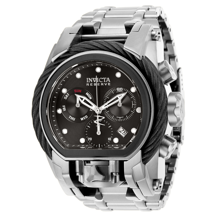 Black and silver-tone stainless steel case with a silver-tone stainless steel bracelet. Fixed black and silver-tone stainless steel bezel. Black dial with silver-tone hands and index hour markers. Minute markers around the outer rim. Dial Type: Analog. Luminescent hands and markers. Date display between 4 and 5 o'clock position. Three sub-dials displaying: day, 60 second and 30 minute. Ronda Caliber Z60 quartz movement. Scratch resistant Flame Fusion crystal. Screw down, push crown. Solid case back. Unique case shape, case size: 52 mm, case thickness: 20.1 mm. Band width: 34 mm, band length: 8.25 inches. Fold over clasp. Water resistant at 200 meters / 660 feet. Functions: chronograph, date, day, hour, minute, small second. Reserve Series. Sport watch style. Watch label: Swiss Movt. Invicta Reserve Black Dial Mens Watch 26584.