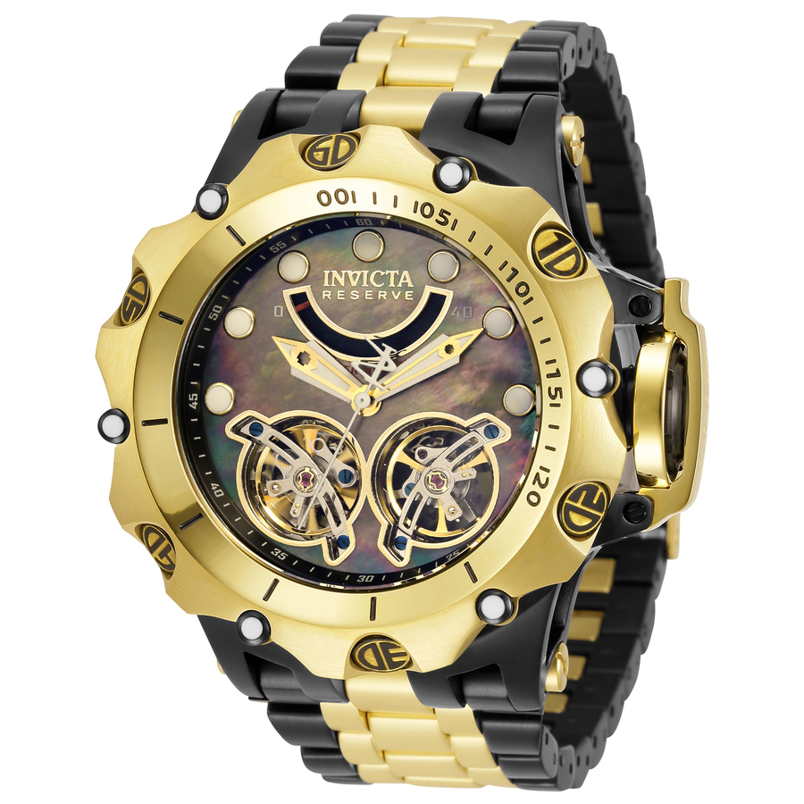 The exceptional taste and distinguished palette of the connoisseur will discover timeless pleasure within the Invicta Reserve collection. Specially developed for those in the know Reserve is a reinvention of the superb to create the ultimate in horological finery. These timepieces represent a pinnacle in superiority for the discerning aficionado. Two-tone (black and gold-tone) stainless steel case and bracelet. Bi-directional rotating two-tone (black and gold-tone) stainless steel bezel. Mother of pearl dial with gold-tone hands and index hour markers. Minute markers around the outer rim. Dial Type: Analog. Luminescent hands and markers. One subdial displaying: power reserve indicator. Jord Caliber JHLS32 Automatic movement, containing 47 Jewels, bitting at 21600 vph, and has a power reserve of approximately 40 hours. Scratch resistant Flame Fusion crystal. Screw down crown. Transparent see through case back. Round case shape, case size: 51 mm, case thickness: 20.50 mm. Band width: 31 mm, band length: 8.25 inches. Fold over clasp. Water resistant at 500 meters / 1650 feet. Functions: hour, minute, second, power reserve indicator. Reserve Series. Dive watch style. Invicta Reserve Automatic Mother of Pearl Dial Mens Watch 33555.
