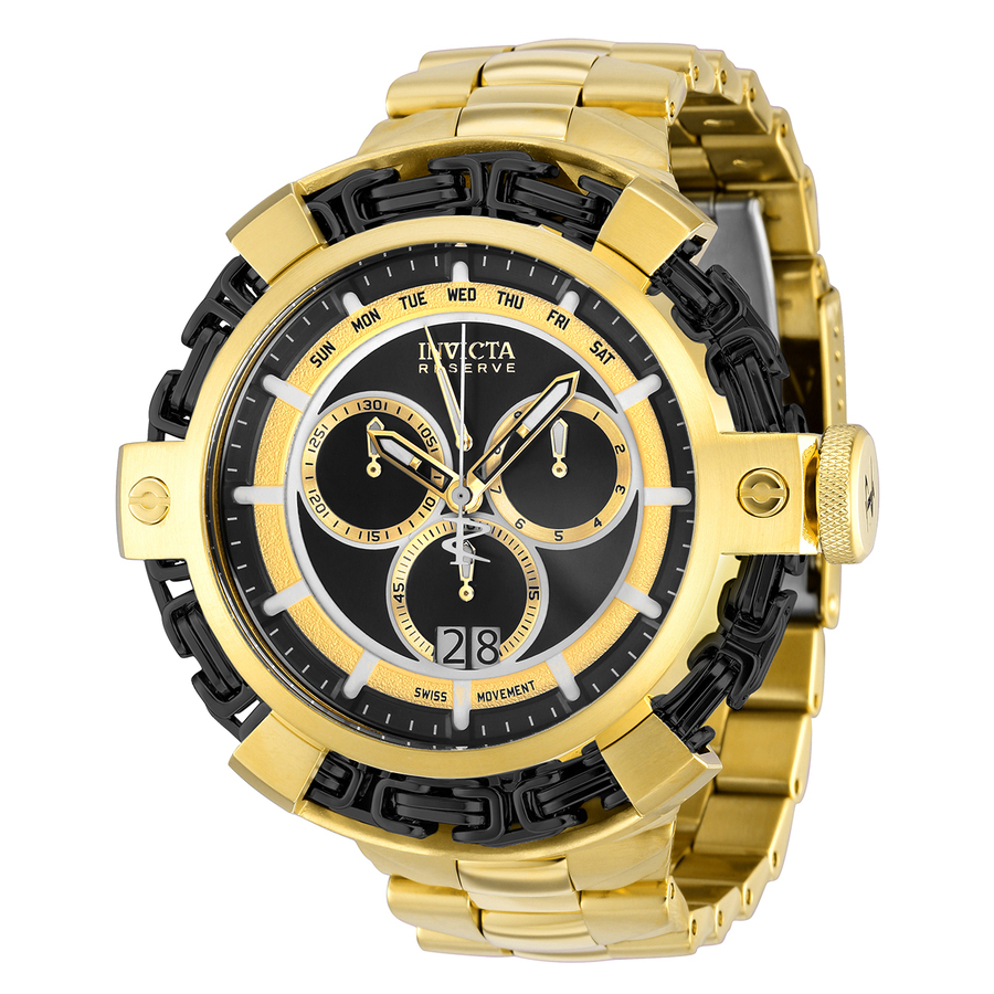 Yellow gold-tone stainless steel case and bracelet. Fixed yelow gold-tone bezel with black chain link trim. Black and gold dial with gold-tone hands and index hour markers. Minute markers around the outer rim. Dial Type: Analog. Luminescent hands and markers. Date display at the 6 o'clock position. retrograde Day of the week display centered on the 12 o'clock position. Chronograph - three sub-dials displaying: 60 second, 30 minute and 1/10th of a second. Ronda caliber 8040.N quartz movement. Scratch resistant Flame Fusion crystal. Screw down crown. Solid case back. Round case shape. Case size: 61.50 mm. Case thickness: 17.2 mm. Band width: 30.40 mm. Band length: 8.25 inches. Fold over clasp. Water resistant at 200 meters / 660 feet. Functions: chronograph, retrograde, big date, day, hour, minute, small second. Reserve Series. Casual watch style. Watch label: Swiss Movt. Invicta Reserve Chronograph Quartz Black Dial Mens Watch 36186.