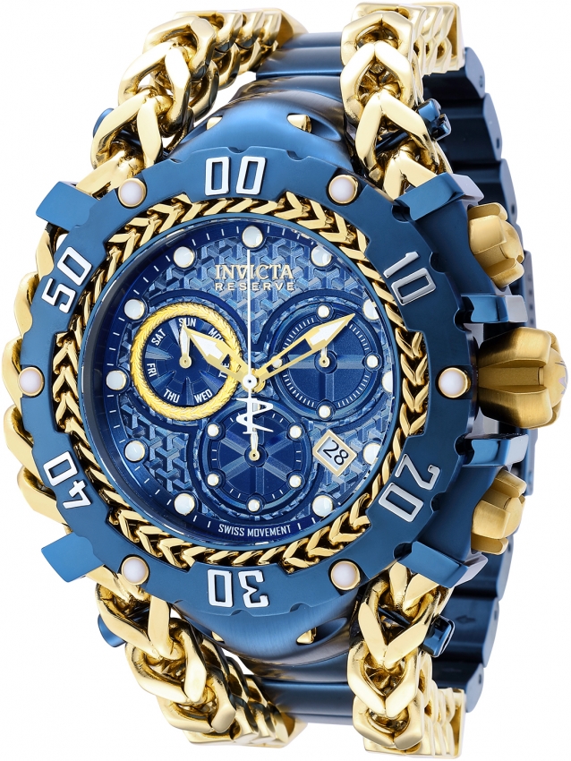 Dark blue and gold stainless steel case and bracelet. Uni-directional rotating dark blue and gold stainless steel bezel. Blue dial with gold-tone hands and index hour markers. Minute markers around the outer rim. Dial Type: Analog. Luminescent hands and markers. Date display between 4 and 5 o'clock position. Three sub-dials displaying: day, 60 second and 30 minute. Ronda Caliber Z60 quartz movement. Scratch resistant Flame Fusion crystal. Screw down crown. Solid case back. Round case shape, case size: 55.25 mm, case thickness: 19.25 mm. Band width: 41 mm, band length: 8.25 inches. Fold over clasp. Water resistant at 200 meters / 660 feet. Functions: chronograph, date, day, hour, minute, small second. Gladiator Series. Casual watch style. Watch label: Swiss Movt. Invicta Gladiator Chronograph Quartz Blue Dial Mens Watch 36623.