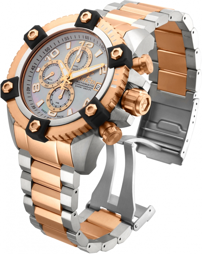 Two-tone (silver-tone and rose gold-tone) stainless steel case with a silver-tone and rose gold stainless steel bracelet. Uni-directional rotating gold-tone stainless steel bezel. Platinum dial with gold-tone hands and index-Arabic numeral hour markers. Minute markers around the outer rim. Dial Type: Analog. Luminescent hands and markers. Date display at the 3 o'clock position. Chronograph - three sub-dials displaying: 60 second, 30 minute and 12 hour. ETA-Valgranges Caliber A07.211 Automatic movement, based upon ETA 7750, containing 25 Jewels, bitting at 28800 vph, and has a power reserve of approximately 46 hours. Scratch resistant Flame Fusion crystal. Screw down crown. Round case shape, case size: 52 mm, case thickness: 18.7 mm. Band width: 31 mm, band length: 8.75 inches. Fold over clasp. Water resistant at 200 meters / 660 feet. Functions: chronograph, date, hour, minute, small second, chronometer. Reserve Series. Sport watch style. Watch label: Swiss Made. Invicta Reserve Chronograph Automatic Chronometer Mens Watch 13760.