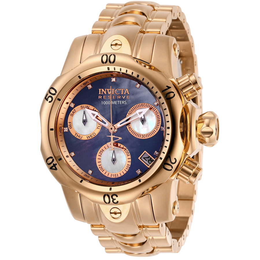 Rose gold-tone stainless steel case and bracelet. Uni-directional rotating rose gold-tone stainless steel bezel. Black dial with rose gold-tone hands and index hour markers. Minute markers around the outer rim. Dial Type: Analog. Luminescent hands and markers. Date display between 4 and 5 o'clock position. Three sub-dials displaying: day, 60 second and 30 minute. Ronda Caliber Z60 quartz movement. Scratch resistant Flame Fusion crystal. Screw down crown. Solid case back. Round case shape, case size: 41.5 mm, case thickness: 15.6 mm. Band width: 20 mm, band length: 7 inches. Fold over clasp. Water resistant at 1000 meters / 3300 feet. Functions: chronograph, date, day, hour, minute, small second. Reserve Series. Dive watch style. Watch label: Swiss Movt.