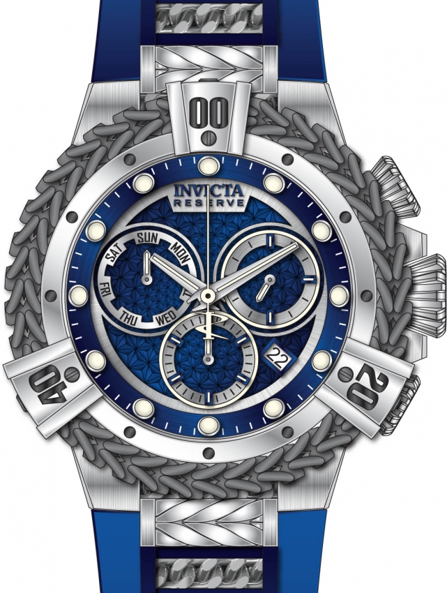 Silver-tone and titanium stainless steel case with a silver-tone and blue silicone and stainless steel strap. Uni-directional rotating silver-tone and titanium stainless steel bezel. Blue dial with silver-tone hands and index hour markers. Minute markers around the outer rim. Dial Type: Analog. Luminescent hands and markers. Date display between 4 and 5 o'clock position. Three sub-dials displaying: day, 60 second and 30 minute. Ronda Caliber Z60 quartz movement. Scratch resistant Flame Fusion crystal. Screw down crown. Solid case back. Round case shape, case size: 53 mm, case thickness: 19.25 mm. Band width: 31 mm, band length: 8.25 inches. Buckle clasp. Water resistant at 200 meters / 660 feet. Functions: chronograph, date, day, hour, minute, small second. Reserve Series. Sport watch style. Watch label: Swiss Movt. Invicta Reserve Chronograph Quartz Blue Dial Mens Watch 33151.