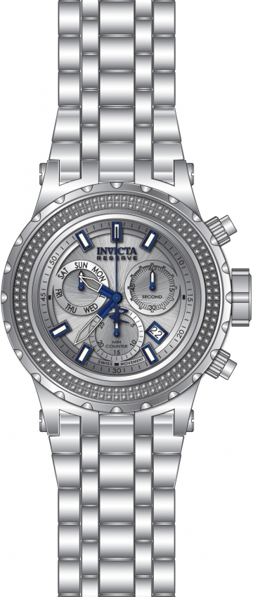 Silver-tone stainless steel case and bracelet. Fixed silver-tone and white stainless steel and diamond bezel. Silver-tone dial with blue skeleton hands and index hour markers. Minute markers around the outer rim. Dial Type: Analog. Luminescent markers. Date display between 4 and 5 o'clock position. Three sub-dials displaying: day, 60 second and 30 minute. Ronda Caliber Z60 quartz movement. Scratch resistant Flame Fusion crystal. Screw down crown. Solid case back. Round case shape, case size: 52 mm, case thickness: 17.55 mm. Band width: 31 mm, band length: 8.25 inches. Fold over clasp. Water resistant at 500 meters / 1650 feet. Functions: chronograph, date, day, hour, minute, small second. Reserve Series. Sport watch style. Watch label: Swiss Movt. Invicta Reserve Chronograph Quartz Diamond Silver Dial Mens Watch 32797.