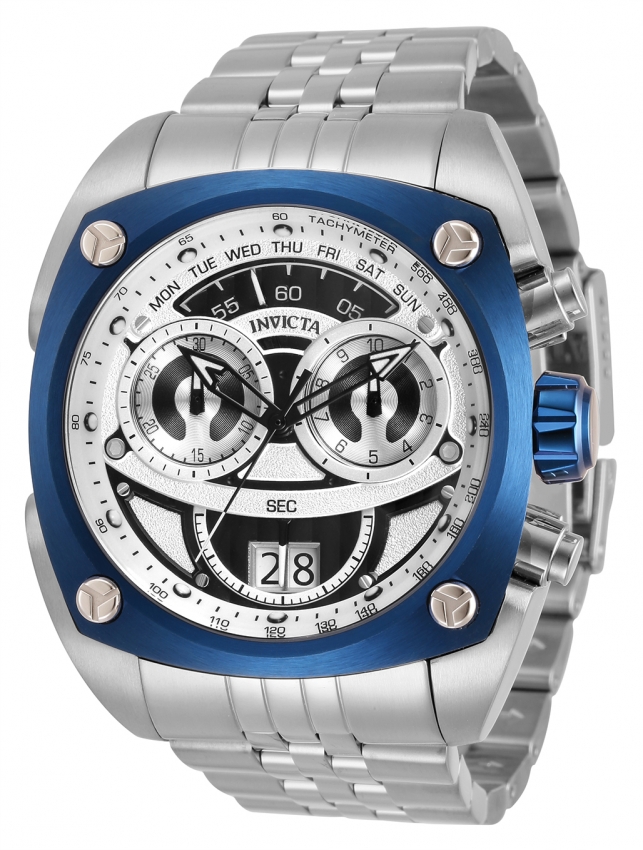 Silver-tone stainless steel case and bracelet. Fixed blue and silver stainless steel bezel. Black and silver dial with black hands and index hour markers. Tachymeter scale around the outer rim. Dial Type: Analog. Luminescent hands and markers. Date display at the 6 o'clock position. Four sub-dials displaying: 60 second, 30 minute and 1/10th of a second and retrograde day. Ronda Caliber 8040.N quartz movement. Scratch resistant Flame Fusion crystal. Pull / push crown. Solid case back. Cushion case shape, case size: 48 mm, case thickness: 11 mm. Band width: 28 mm, band length: 7.25 inches. Fold over clasp. Water resistant at 100 meters / 330 feet. Functions: chronograph, retrograde, big date, day, hour, minute, small second. Reserve Series. Sport watch style. Watch label: Swiss Movt. Invicta Reserve Chronograph Quartz Mens Watch 32070.