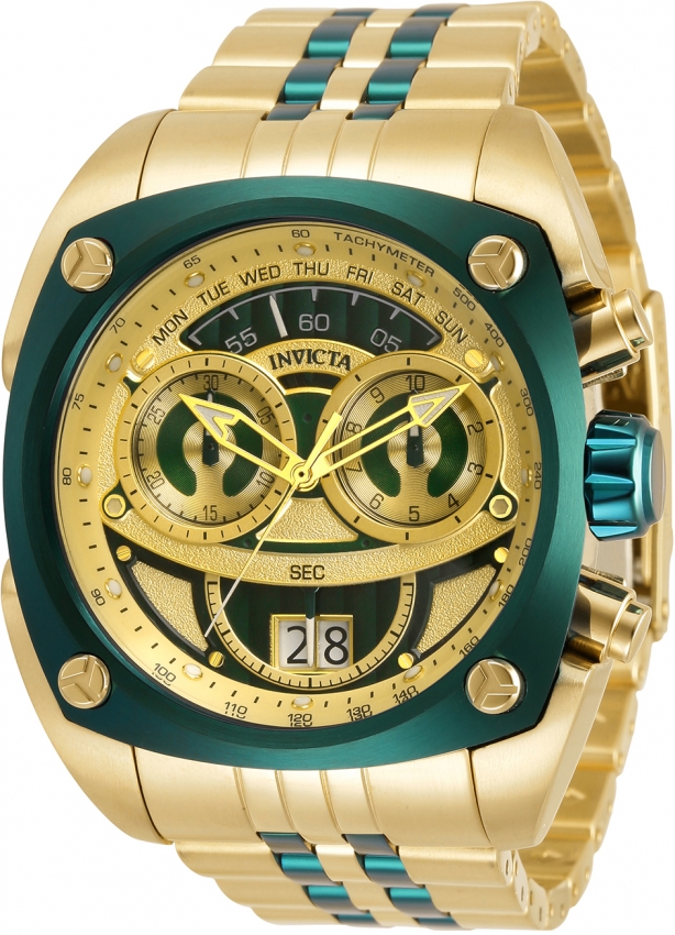 Gold-tone stainless steel case with a two-tone (gold-tone and green) stainless steel bracelet. Fixed gold and green stainless steel bezel. Gold and green dial with gold-tone hands and index hour markers. Tachymeter scale around the outer rim. Dial Type: Analog. Luminescent hands and markers. Date display at the 6 o'clock position. Four sub-dials displaying: 60 second, 30 minute and 1/10th of a second and retrograde day. Ronda Caliber 8040.N quartz movement. Scratch resistant Flame Fusion crystal. Pull / push crown. Solid case back. Cushion case shape, case size: 48 mm, case thickness: 11 mm. Band width: 28 mm, band length: 7.25 inches. Fold over clasp. Water resistant at 100 meters / 330 feet. Functions: chronograph, retrograde, big date, day, hour, minute, small second. Reserve Series. Sport watch style. Watch label: Swiss Movt. Invicta Reserve Chronograph Quartz Mens Watch 32074.