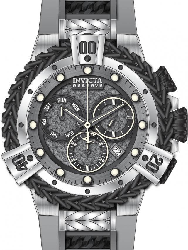 Black and silver-tone stainless steel case with a titanium and black silicone and stainless steel strap. Uni-directional rotating black and silver-tone stainless steel bezel. Titanium dial with gunmetal hands and index hour markers. Minute markers around the outer rim. Dial Type: Analog. Luminescent hands and markers. Date display between 4 and 5 o'clock position. Three sub-dials displaying: day, 60 second and 30 minute. Ronda Caliber Z60 quartz movement. Scratch resistant Flame Fusion crystal. Screw down crown. Solid case back. Round case shape, case size: 53 mm, case thickness: 19.25 mm. Band width: 31 mm, band length: 8.25 inches. Buckle clasp. Water resistant at 200 meters / 660 feet. Functions: chronograph, date, day, hour, minute, small second. Reserve Series. Sport watch style. Watch label: Swiss Movt. Invicta Reserve Chronograph Quartz Mens Watch 33153.
