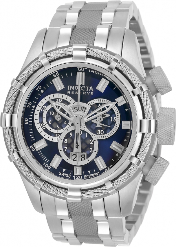 Silver-tone and titanium stainless steel case and bracelet. Fixed silver-tone and titanium stainless steel bezel. Blue and steel dial with silver-tone hands and index hour markers. Tachymeter scale around the outer rim. Dial Type: Analog. Luminescent hands and markers. Date display at the 6 o'clock position. Chronograph - three sub-dials displaying: 60 second, dual 12 hour / 30 minute and 1/10th of a second. Ronda Caliber 5050.C quartz movement. Scratch resistant Flame Fusion crystal. Screw down crown. Solid case back. Round case shape, case size: 50 mm, case thickness: 17 mm. Band width: 26 mm, band length: 8 inches. Fold over clasp. Water resistant at 200 meters / 660 feet. Functions: chronograph, big date, day, hour, minute, small second. Reserve Series. Sport watch style. Watch label: Swiss Movt. Invicta Reserve Chronograph Quartz Mens Watch 33308.