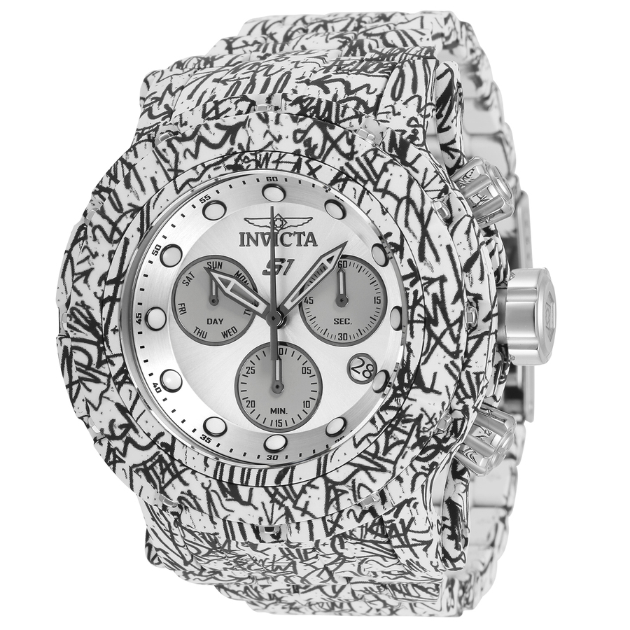 Aqua-plating and silver-tone and white stainless steel case with a silver-tone and aqua plating and white stainless steel bracelet. Uni-directional rotating silver-tone and aqua-plating stainless steel bezel. Antique silver dial with black hands and index hour markers. Minute markers around the outer rim. Dial Type: Analog. Luminescent hands and markers. Date display at the 4 o'clock position. Three sub-dials displaying: day, 60 second and 30 minute. Ronda Caliber Z60 FE quartz movement. Scratch resistant Flame Fusion crystal. Screw down crown. Solid case back. Round case shape, case size: 54 mm, case thickness: 20.4 mm. Band width: 35 mm, band length: 8.25 inches. Fold over clasp. Water resistant at 500 meters / 1650 feet. Functions: chronograph, date, day, hour, minute, second. Reserve Series. The exceptional taste and distinguished palette of the connoisseur will discover timeless pleasure within the Invicta Reserve collection. Specially developed for those in the know Reserve is a reinvention of the superb to create the ultimate in horological finery. These timepieces represent a pinnacle in superiority for the discerning aficionado. Dive watch style. Watch label: Swiss Movt. Invicta Reserve Chronograph Quartz Mens Watch 34894.