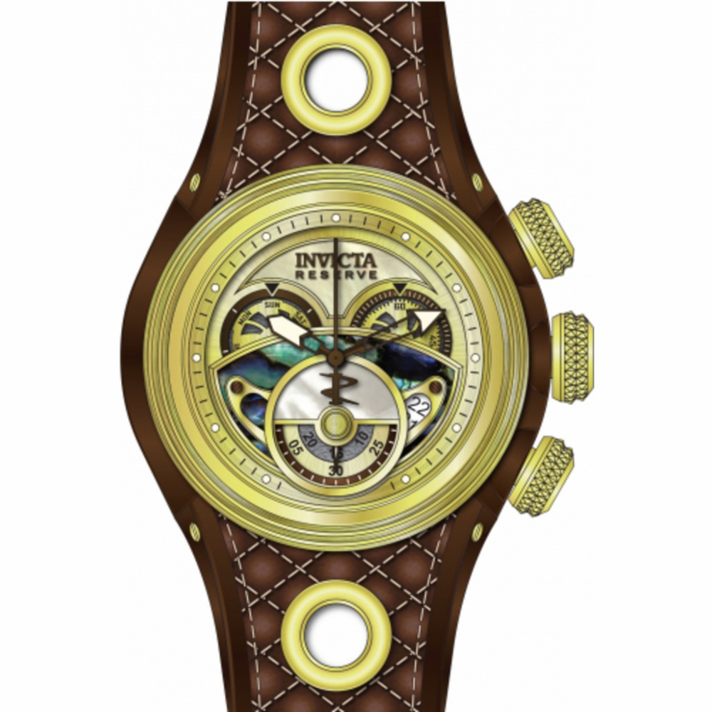 Brown and gold plastic and stainless steel case with a brown and gold leather and silicone and stainless steel strap. Fixed gold-tone stainless steel bezel. Gold and champagne and brown and white and blue dial with index hour markers. Minute markers around the outer rim. Dial Type: Analog. Date display between 4 and 5 o'clock position. Three sub-dials displaying: day, 60 second and 30 minute. Ronda Caliber Z60 quartz movement. Scratch resistant Flame Fusion crystal. Screw down crown. Solid case back. Round case shape, case size: 43.5 mm, case thickness: 17.8 mm. Band width: 26 mm, band length: 8.25 inches. Buckle clasp. Water resistant at 200 meters / 660 feet. Functions: chronograph, date, day, hour, minute, small second. Reserve Series. Casual watch style. Watch label: Swiss Movt. Invicta Reserve Chronograph Quartz Mens Watch 38878.