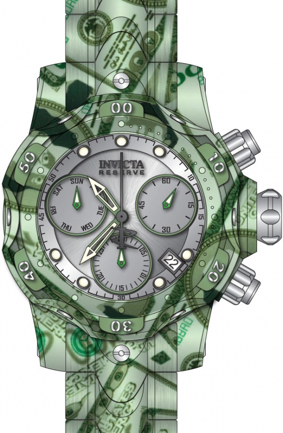 Silver-tone and aqua-plating and green stainless steel and aluminum case with a silver-tone and aqua plating stainless steel bracelet. Uni-directional rotating aqua-plating and green and silver stainless steel and aluminum bezel. Silver-tone dial with silver-tone hands and index hour markers. Minute markers around the outer rim. Dial Type: Analog. Luminescent hands and markers. Date display between 4 and 5 o'clock position. Three sub-dials displaying: day, 60 second and 30 minute. Ronda Caliber Z60 quartz movement. Scratch resistant Flame Fusion crystal. Screw down crown. Solid case back. Round case shape, case size: 44.4 mm, case thickness: 20.0 mm. Band width: 20 mm, band length: 7.25 inches. Fold over clasp. Water resistant at 1000 meters / 3300 feet. Functions: chronograph, date, day, hour, minute, small second. Reserve Series. Dive watch style. Watch label: Swiss Movt. Invicta Reserve Chronograph Quartz Silver Dial Ladies Watch 34652.